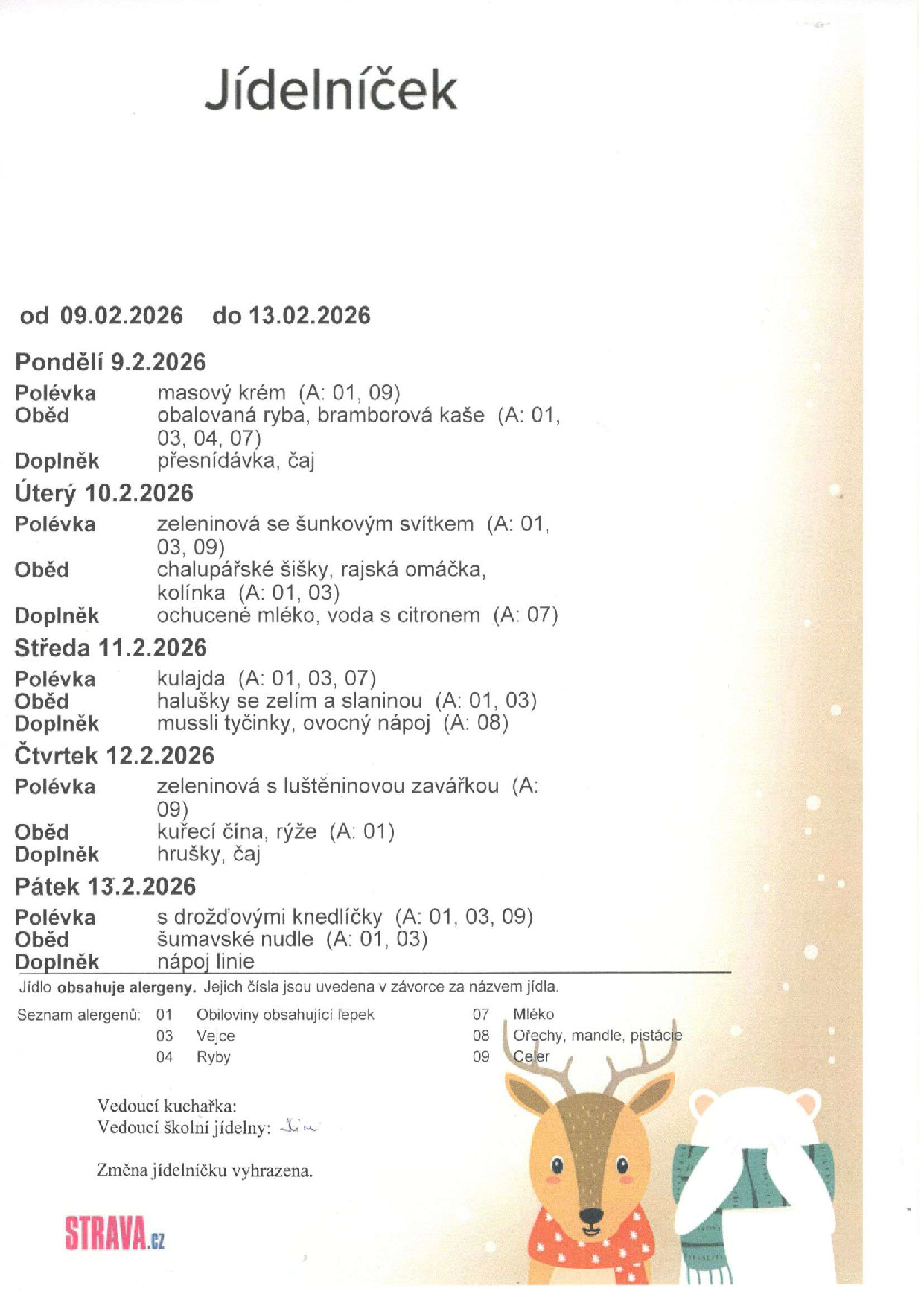 Seznam alergenů uvádím níže. Na jídelních lístcích naleznete pouze čísla alergenů, která odpovídají číslům uvedeným v seznamu.